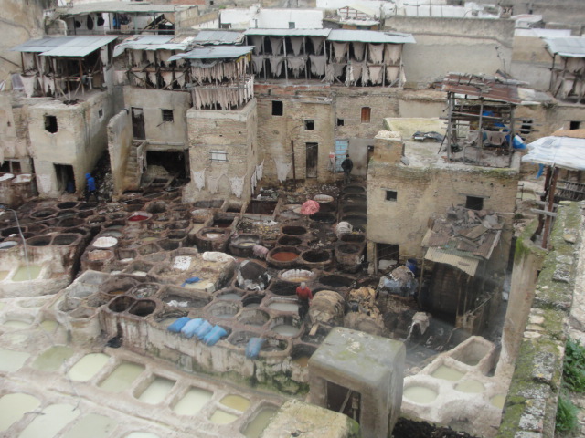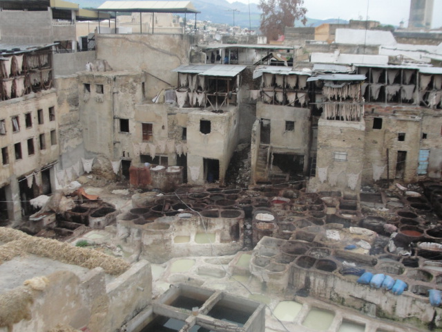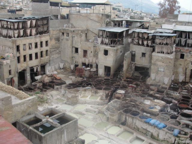 Now we were in a large leather shop that seemed to go up for several floors, ottomans, purses, sandals and so forth. Michel introduced us to a man who started to take us in another direction, then he was gone. As Michel was running out the door he ordered us to wait there, he’d be back. I assumed he was heading downstairs to corner the market in leather satchels. The leather man took Latoya and I up several flights of stairs to a terrace which overlooked the rooftops of the Medina. We could now see it in it’s enormity, off to the horizon the rooftops stretched, easily the size of the downtown district of a city. The man directed us to the edge of the balcony, we looked down on ancient stone vats where leather was cured and dyed. There must have been between 50 and 100 vats each the shape of a bathtub, each filled with a different bright colored dye. Animal skins stacked in gruesome piles and men with poles walked cat-like along the edges of the vats. In the corner was a massive wooden water wheel that churned slowly. I suppose they have been doing it that way for a thousand years, this being the oldest tannery in Africa, one of the oldest in the world. We hung around getting a load of this for a while even though the whole place stank to hell like rot.