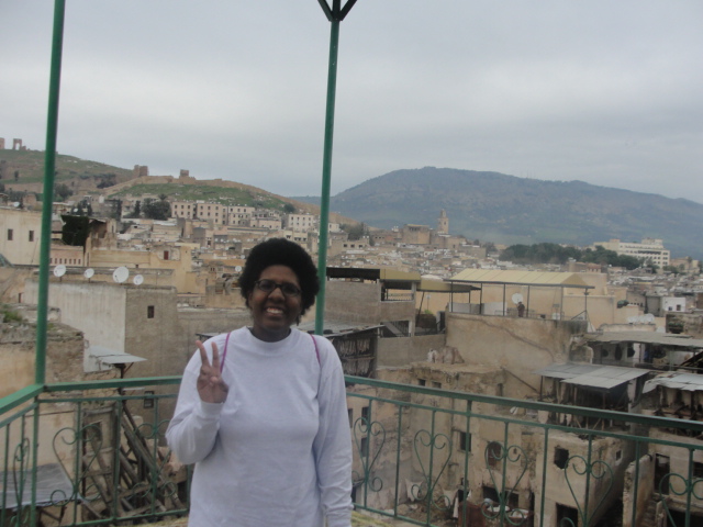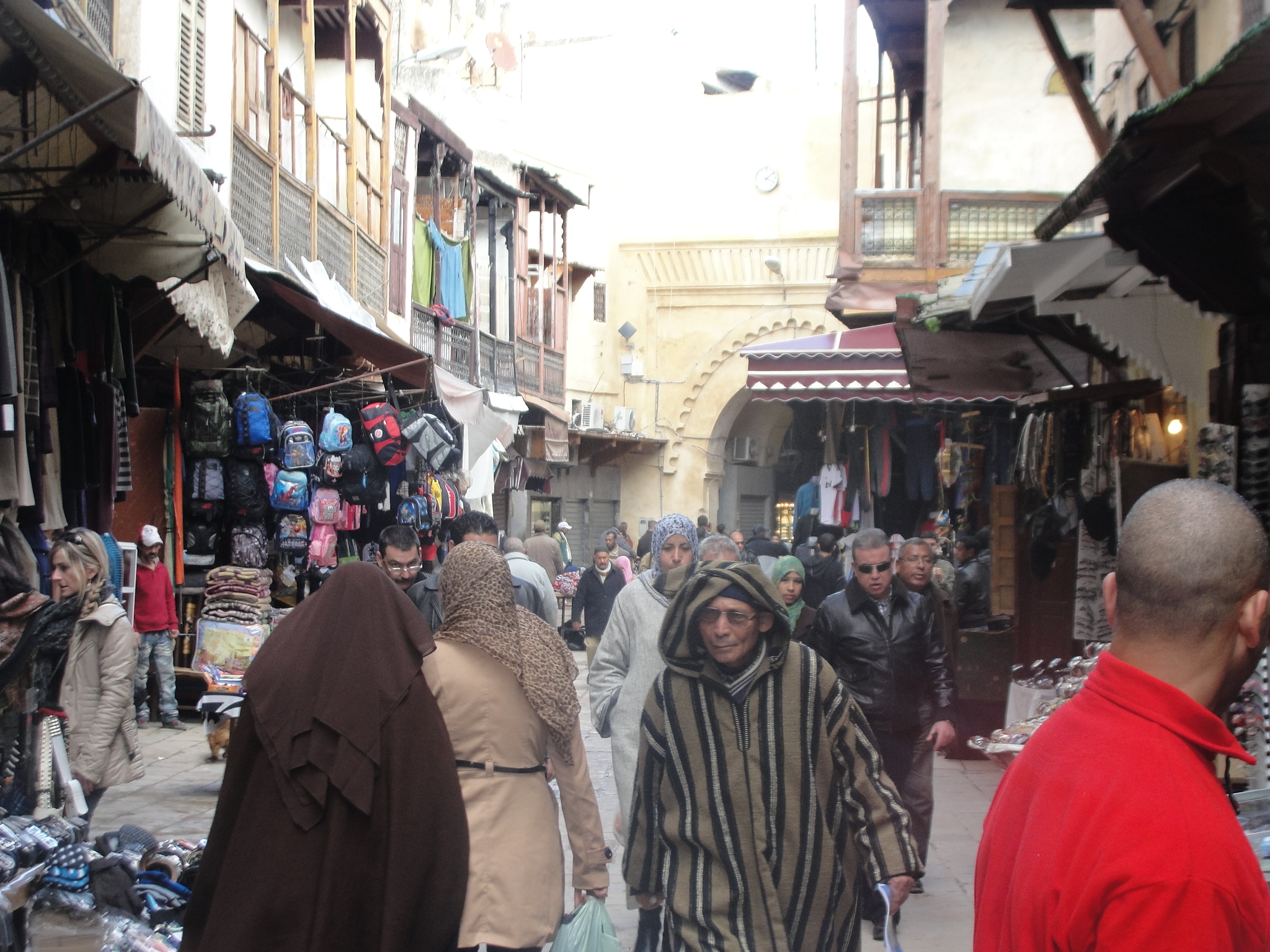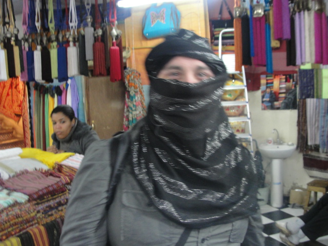 We found the ancient mosque which also housed the regions oldest university. We weren’t allowed in but we were treated to another view from a roof along with another great panorama of the endless medina. Latoya wanted one of those full body cloaks with a hood that the locals sport for her uncle. She was in mid-sentence about it when a helpful young man intercepted us and asked us to follow him to his shop. I was apprehensive, but he seemed like a nice enough young man so we followed. He must have led us around for twenty to thirty minutes. When we got there it turned out to be a two story affair with wooden looms on the side with guys pumping the wood to make the fabric, medieval style. They were very pleased to see us too. Once they sold Latoya her cloak the old woman of the place all decided she was a perfect model for all their traditional dresses. I don’t know if it was part of a sales scheme or what but they never asked us to buy anything. The vibe was friendly and Latoya seemed to be having fun too, the old woman chuckled to each other in Arabic. I bought a black scarf that A) was hand made on the loom and B) makes me look just like a rock star from the late 70’s. They convinced me to buy it after wrapping it around my head with only my eyes showing like an Arab. Ok, ok so the pitch worked. It’s a cool scarf though.